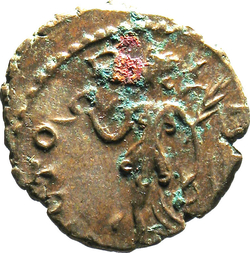 ROMA S C, Roma, helmeted, in military dress, seated left on cuirass, right foot on helmet, holding Victory in extended right hand, left arm on parazonium at side: behind her on right, two round shields