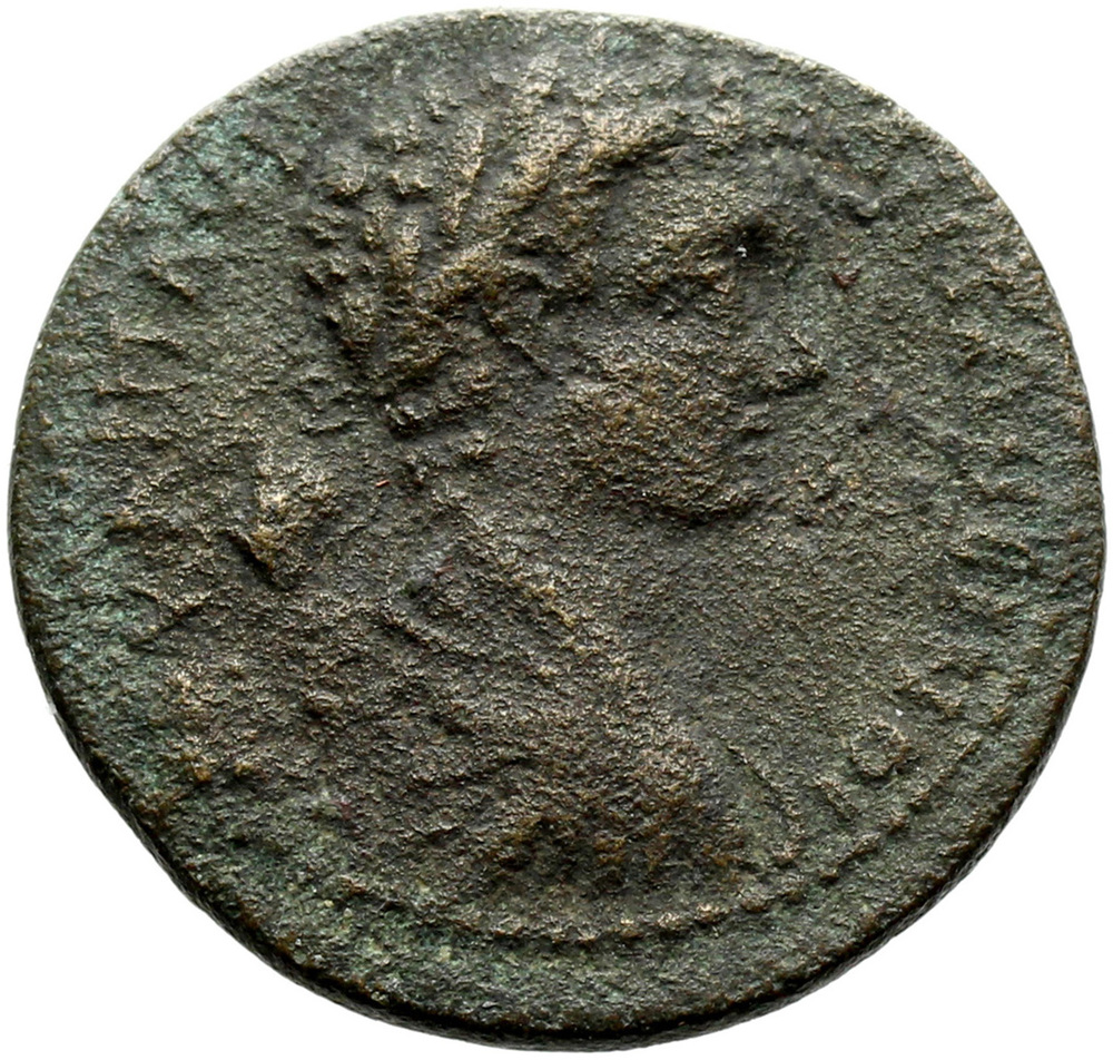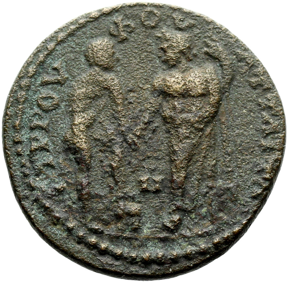 To left, nude male figure (founding hero?) standing with foot on base, right, leaning forward; to right, cult statue of Zeus standing facing, head, left, holding thunderbolt over eagle and long sceptre; Zeus and eagle on base; before base, small figure (infant?)