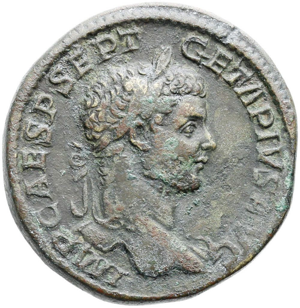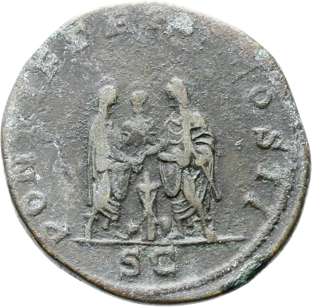 Caracalla and Geta, veiled, togate, standing right and left facing each other, sacrificing out of paterae in right hands over tripod and holding batons in left hands; behind, flute player facing; behind tripod, bull prostrate, left
