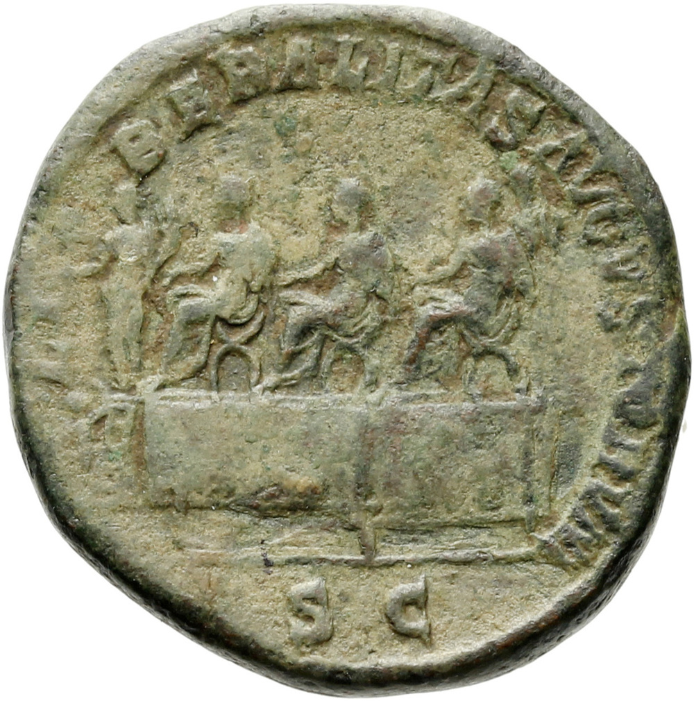 Balbinus, Pupienus, and Gordian III, togate, all seated left on curule chairs on platform; behind them, soldier standing left, holding spear; in front of them, Liberalitas, draped, standing left, holding abacus in right hand and cornucopiae in left hand; below, citizen, mounting steps of platform