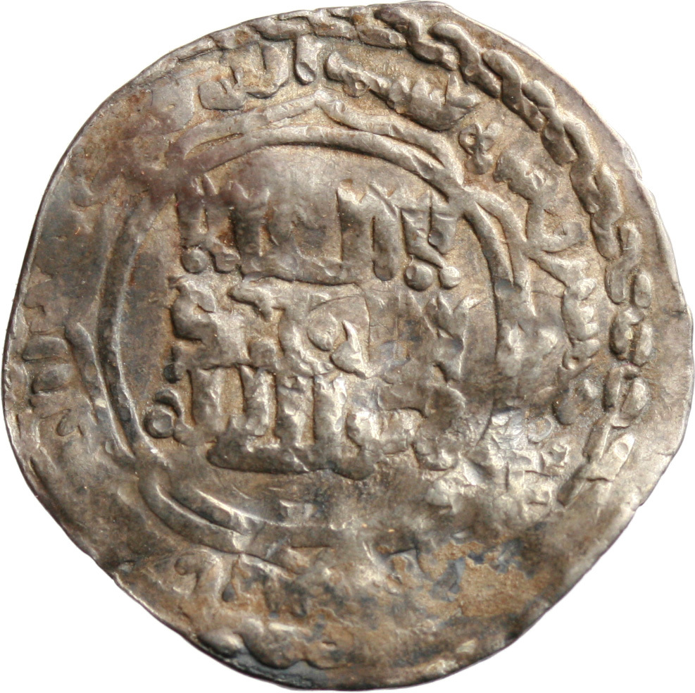 Arabic inscription in field, enclosed by linear circle, enclosed by ornamented quatrefoil, enclosed by Arabic inscription (Sura 61:13) anti-clockwise in margin from 2h, all enclosed by chain border