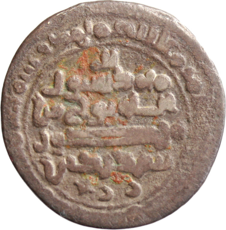 Arabic inscription in field with 'horse-shoe' symbol between two pellets above and mint mark below, enclosed by plain circle, enclosed by illegible Arabic inscription anti-clockwise around in margin