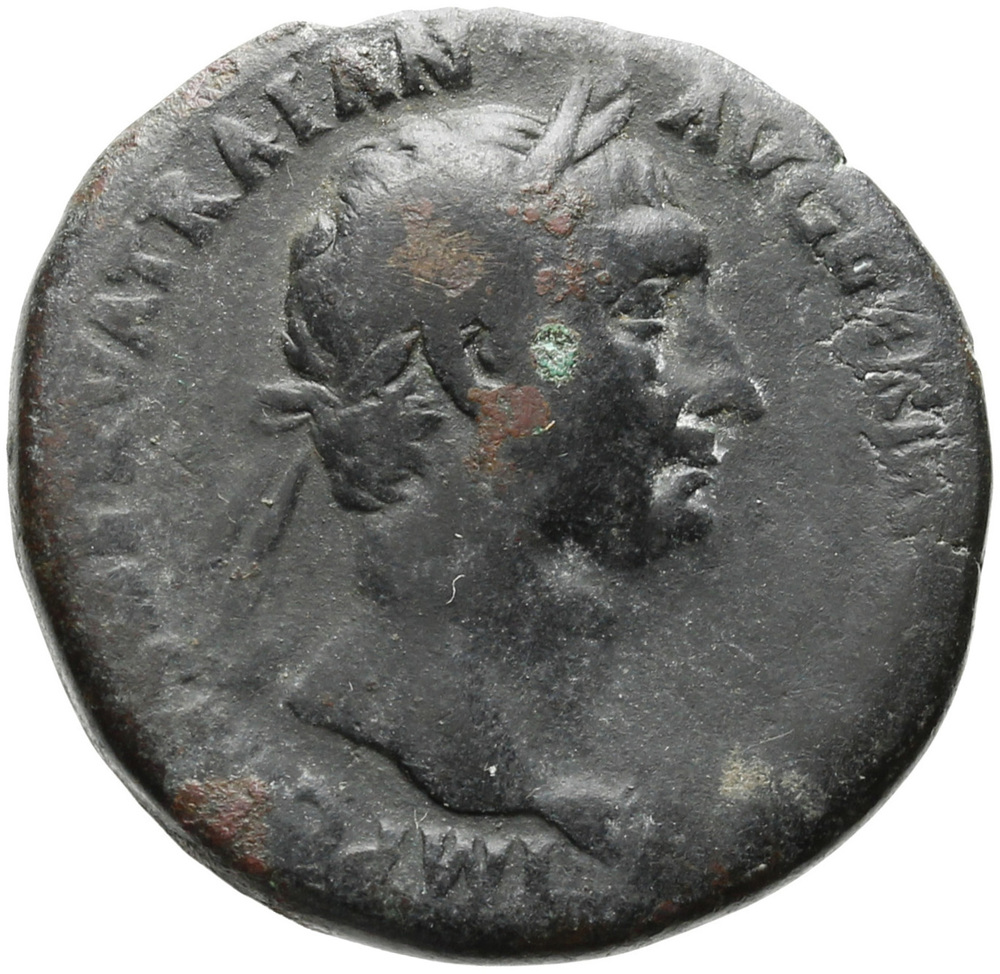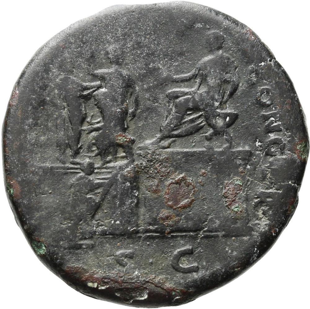 Trajan, togate, seated left on curule chair on platform, right, extending right hand; on lower platform, left, official standing front, head left, holding tessera in raised right hand; in front of official, scribe seated left; togate figure to far left, standing right, holding out drapery and another figure climbing ladder to group on left platform