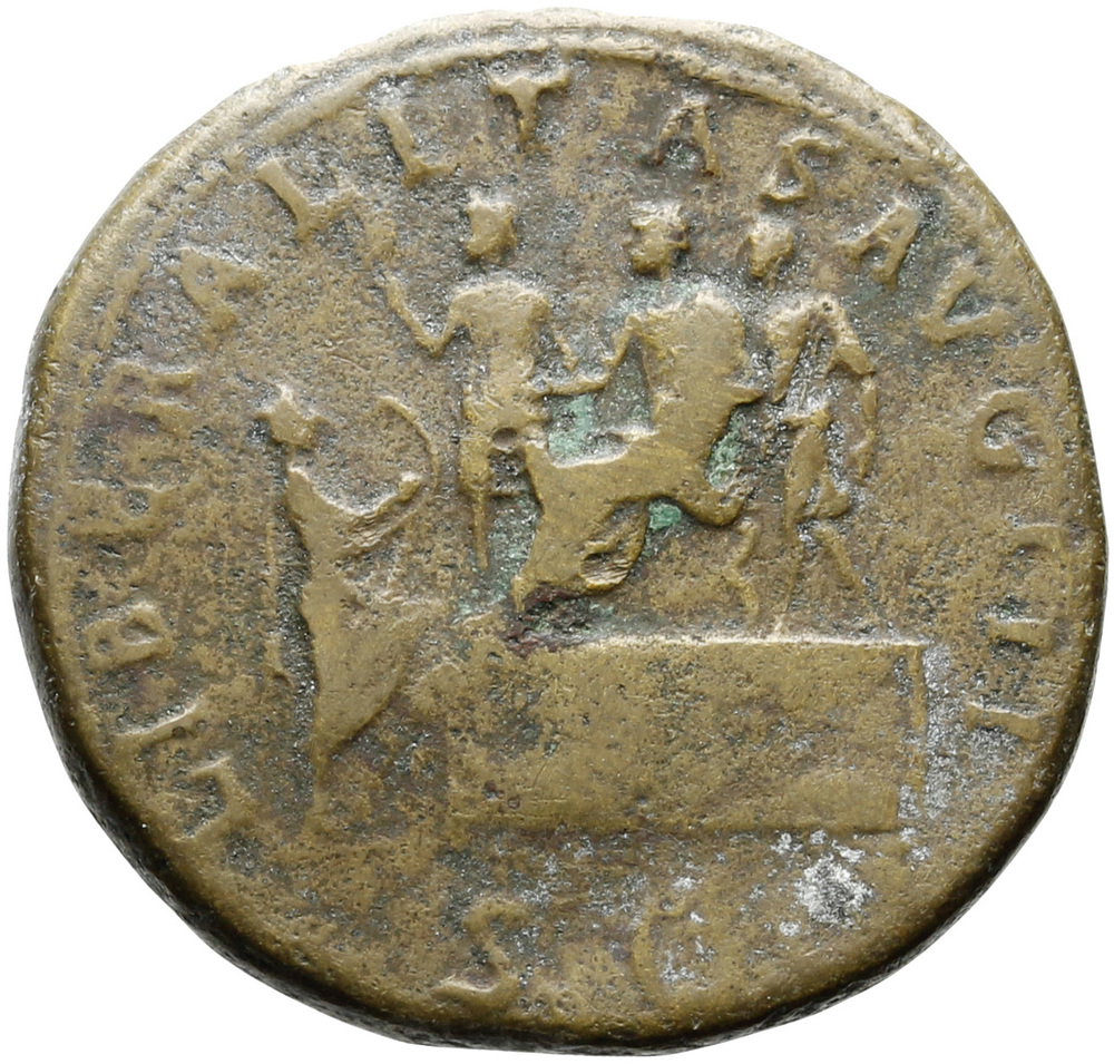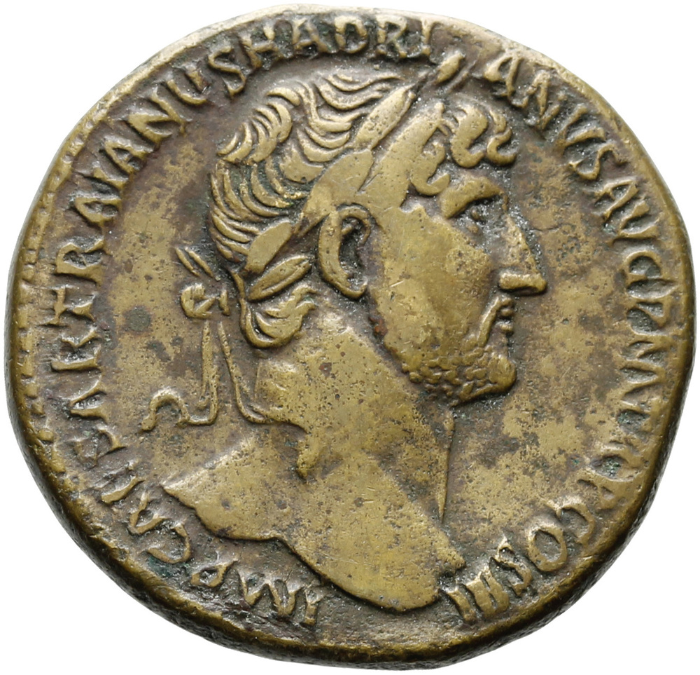 Hadrian, togate, seated left on curule chair on platform, extending right hand toward citizen who is mounting steps up to platform, holding out fold of toga; behind, Liberalitas standing facing, head sometimes left, holding coin scoop; to right, attendant standing left