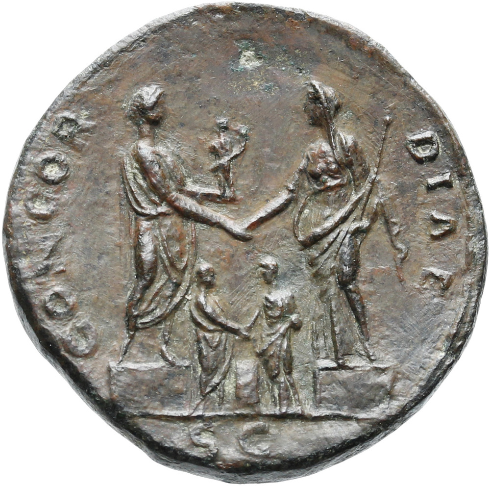 Antoninus Pius standing, right holding Victory in left hand, clasping right hands with Faustina the Elder, standing, left, holding vertical sceptre; between them, two small figures of Marcus Aurelius and Faustina the Younger, standing, right and left clasping hands over altar, right