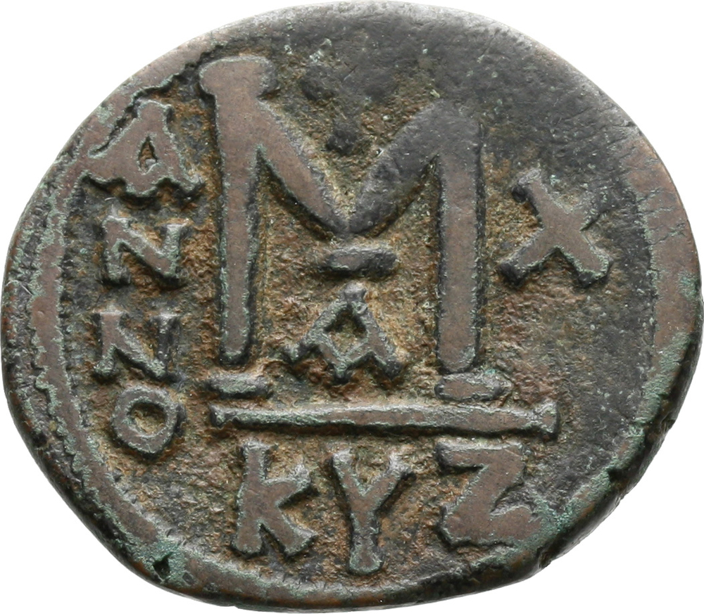 Full-length figures of emperor and empress, nimbate, sitting on double throne with lyre-shaped back; both wear crowns with pendilia; emperor holds globus cruciger in right hand, and empress holds cruciform sceptre. Cross above heads