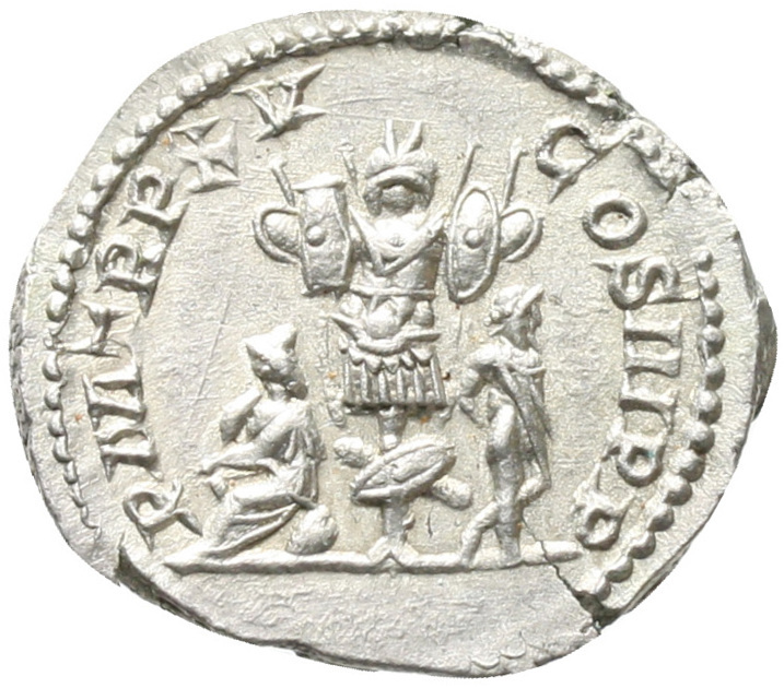 Central trophy, consisting of helmet, cuirass, spears, shields, and greaves; to right, captive, wearing peaked cap and long robe, standing right, hands bound behind back; to left, captive, wearing peaked cap and long robe, seated left, resting head on right hand, right arm propped up on bent knee