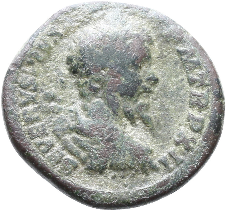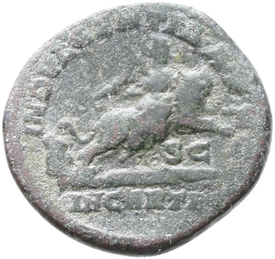 The Dea Caelestis, wearing high head-dress and long robe to feet, seated facing on lion galloping right over waters gushing from rock on left, holding thunderbolt in right hand and short sceptre in left hand