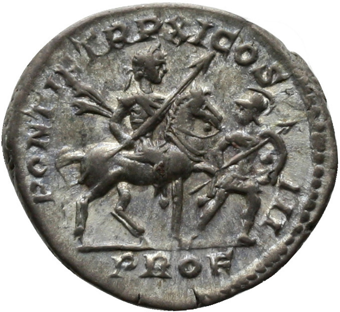 Caracalla, in military attire, cloak floating behind, on horse prancing right, holding raised spear in hand; before, soldier, helmeted, walking right, head left, holding transverse spear in right hand hand shield in left hand