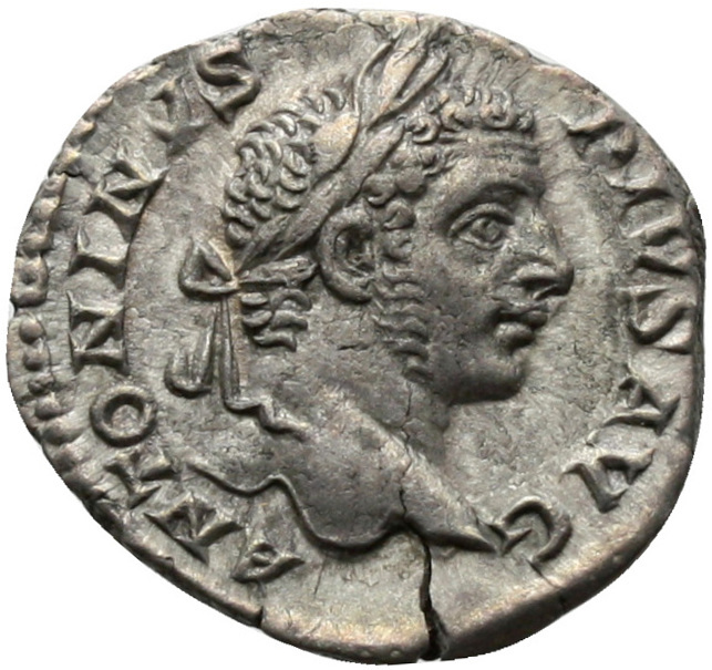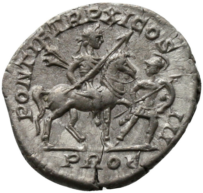 Caracalla, in military attire, cloak floating behind, on horse prancing right, holding raised spear in hand; before, soldier, helmeted, walking right, head left, holding transverse spear in right hand hand shield in left hand