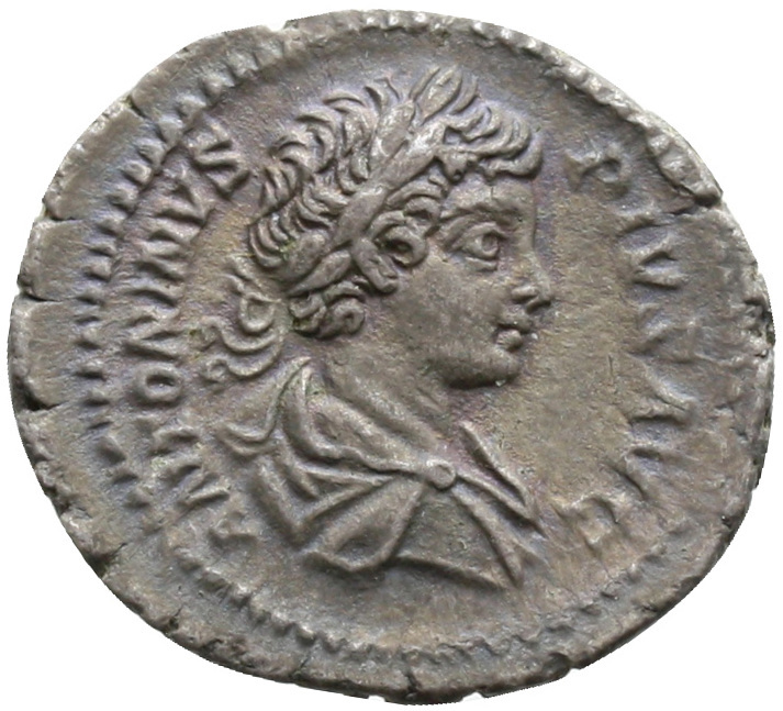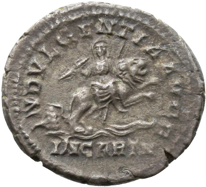 The Dea Caelestis, wearing high head-dress and long robe to feet, seated facing on lion galloping right over waters gushing from rock on left, holding thunderbolt in right hand and short sceptre in left hand