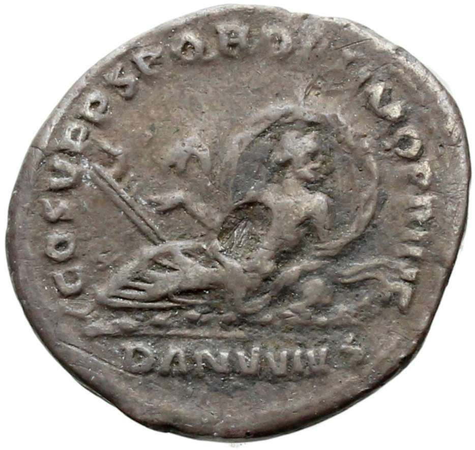 Danuvius (The Danube), naked to waist, cloak floating out behind, reclining left on rocks, head right, placing right hand on prow of ship, left elbow resting on rock; reeds over left and right arms