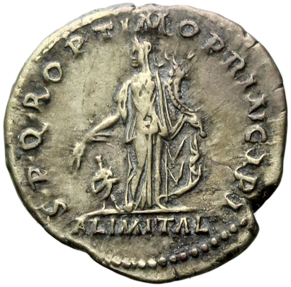 Abundantia, draped, standing front, head left, holding corn-ears over child standing at left side in right hand and cornucopiae in left; child standing front, head right and holds roll in left hand