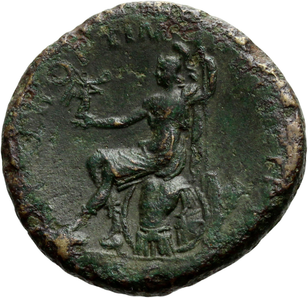 Roma, helmeted, in military dress, seated left on cuirass, holding Victory in extended right hand and vertical spear in left; left foot is on head of Dacian, right on helmet; by cuirass, three shields