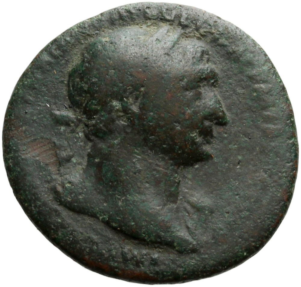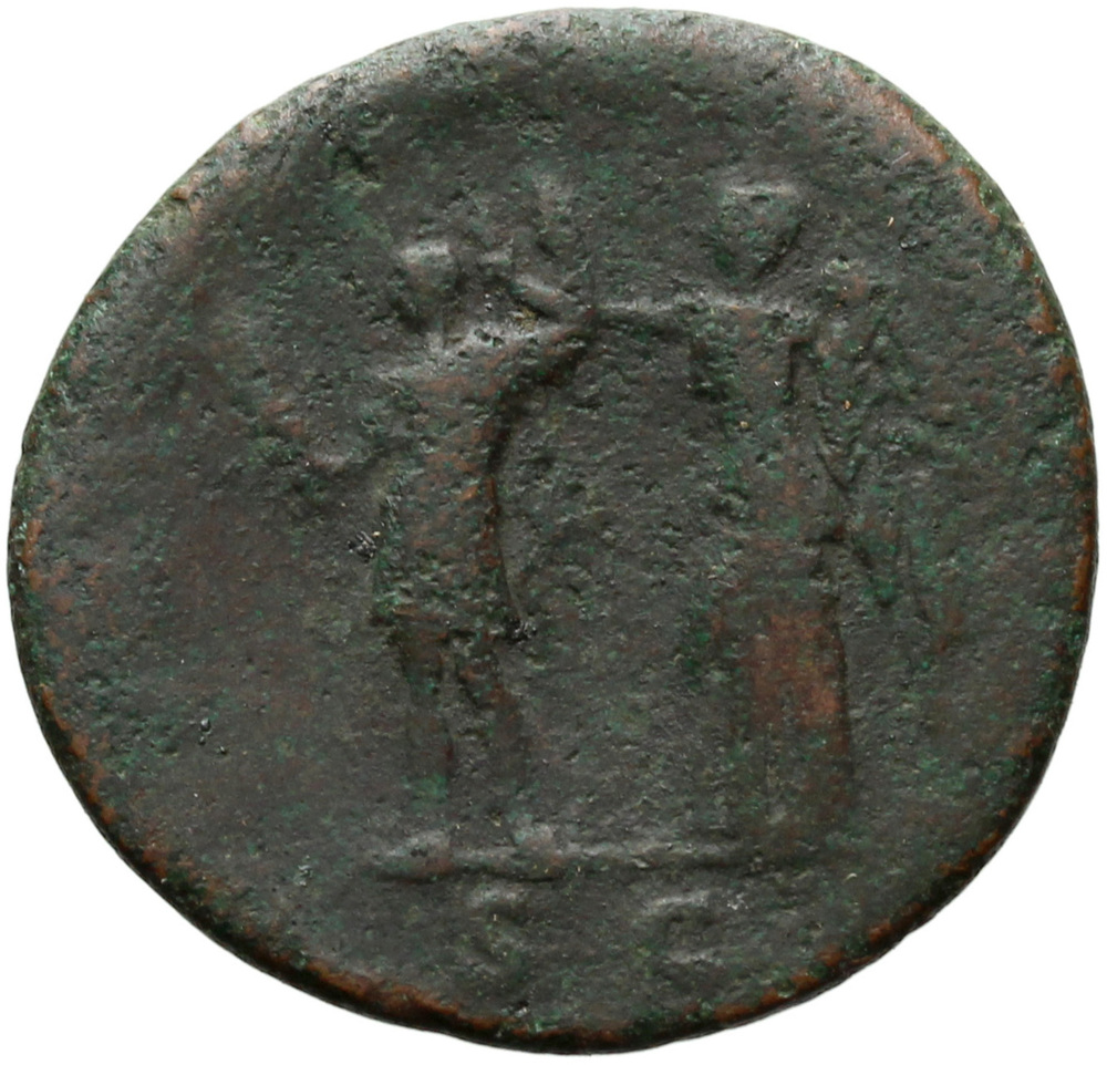 Trajan, bare-headed, in military dress, standing left, holding thunderbolt in right hand and vertical spear reversed in left, being crowned by Victory, draped, standing left, holding palm upright in left hand