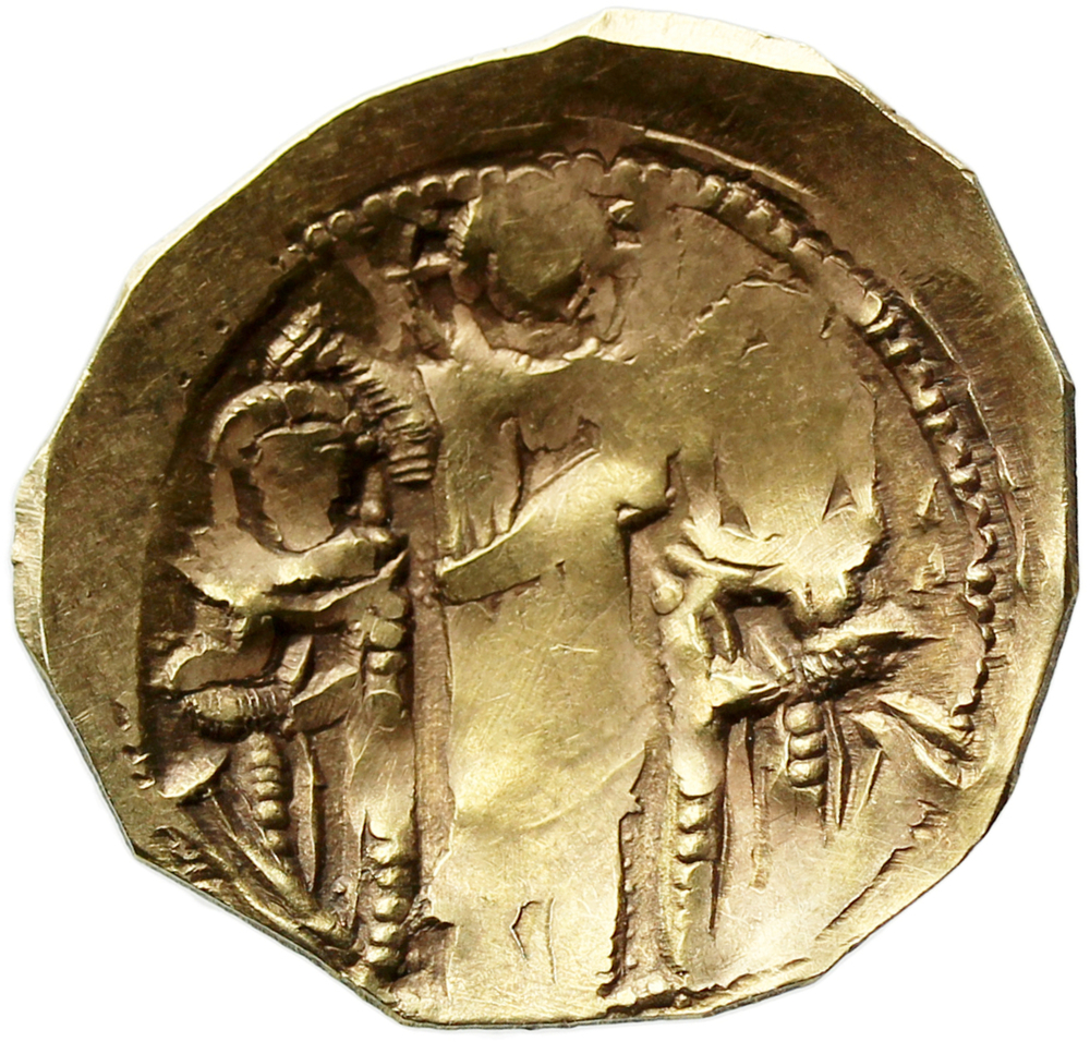 In the centre, full-length figure of Christ, bearded and nimbate, wearing tunic and himation, placing his left and right hands on the emperors' heads. Andronikos II kneeling to the right of Christ, bearded, wearing band-like bejewelled crown with prependoulia, imperial tunic (divetesion/sakkos), loros/diadema, and collar-piece. Michael IX kneeling to the left of Christ, beardless, identically dressed