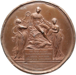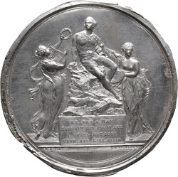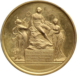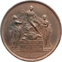 THIS / MEDAL / REPRESENTING SHAKSPEARE BETWEEN / THE DRAMATICK MUSE AND THE GENIUS OF PAINTING / IS RESPECTFULLY PRESENTED TO / THE PERSON / WHOSE NAME IT BEARS / IN GRATEFUL COMMEMORATION OF THE GENEROUS SUPPORT / GIVEN BY THE SUBSCRIBERS / TO THAT GREAT NATIONAL EDITION OF THAT / IMMORTAL POET / BY / I . I. & J. N. BOYDELL. / AND / G. & .W . NICOL. / 1803., inscription around, within rays; a harp with olive branch on scroll