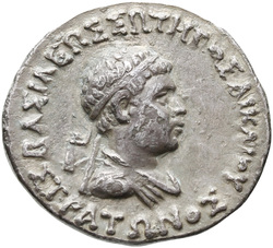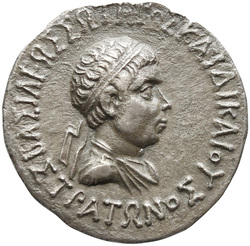 ΒΑΣΙΛΕΩΣ ΣΩΤΗΡΟΣ ΣΤΡΑΤΩΝΟΣ, Bust of Strato I, diademed left, seen from behind, throwing spear with right arm, aegis over left shoulder