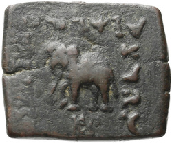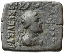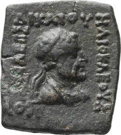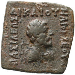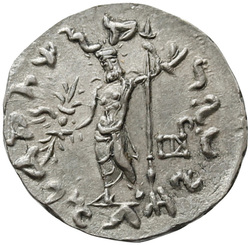 ΒΑΣΙΛΕΩΣ ΔΙΚΑΙΟΥ ΗΛΙΟΚΛΕΟΥΣ, Helmeted bust of Heliocles II, diademed, seen from behind, throwing spear with right arm, aegis over left shoulder