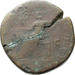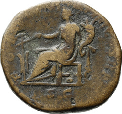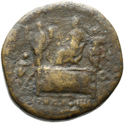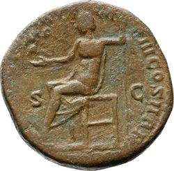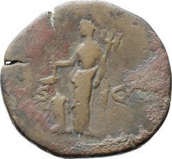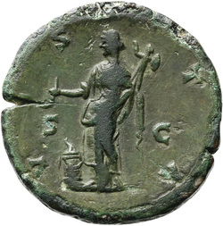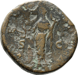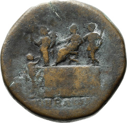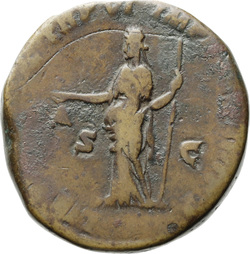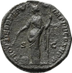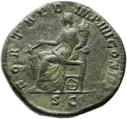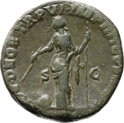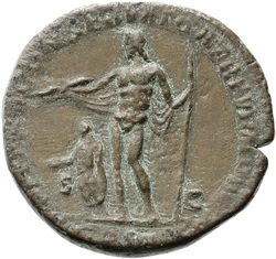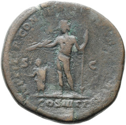 IVPPITER CONSERVATOR AVG TR P VI IMP IIII COS III P P S C, Jupiter standing front, head left, holding thunderbolt in right hand and cloak over Commodus, who stands on left holding branch and sceptre : Jupiter holds sceptre in left hand.