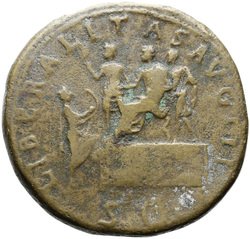 LIB[E]RALI[TA]S AVG III // S C (in exergue), Hadrian, togate, seated left on curule chair on platform, extending right hand toward citizen who is mounting steps up to platform, holding out fold of toga; behind, Liberalitas standing facing, head sometimes left, holding coin scoop; to right, attendant standing left