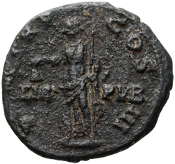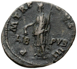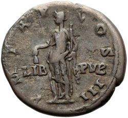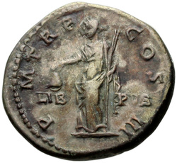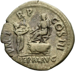 P M TR P COS III, Victory seated left, holding wreath and palm, wings half raised, far wing framing head