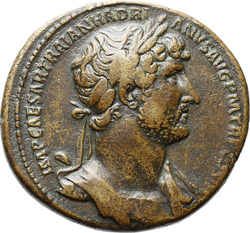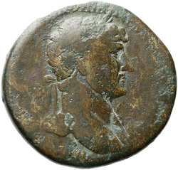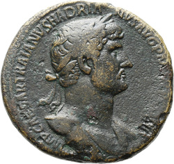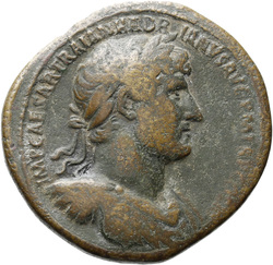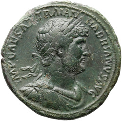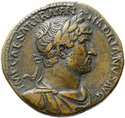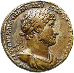 IMP CAESAR TRAIAN HADRIANVS AVG, Bust of Hadrian, laureate, cuirassed, cropped of pteryges, and traces of drapery on far shoulder, right, viewed from front