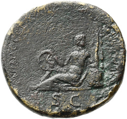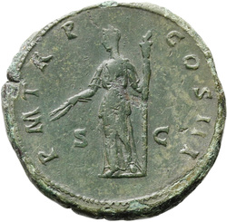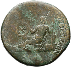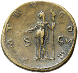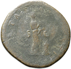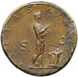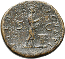 P M TR P COS III // S C (in field), Minerva, helmeted, draped, standing left, placing incense in candelabrum with right hand and holding vertical spear in left; on ground to right, shield containing snake; to left, candelabrum