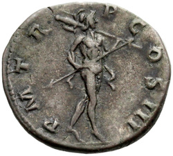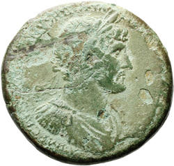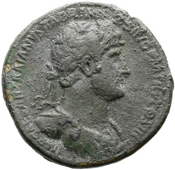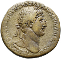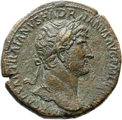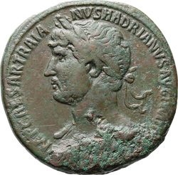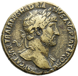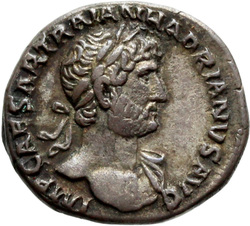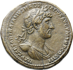 IMP CAESAR TRAIANVS HADRIANVS AVG P M [TR P] COS III, Bust of Hadrian, laureate, draped, right, viewed from front