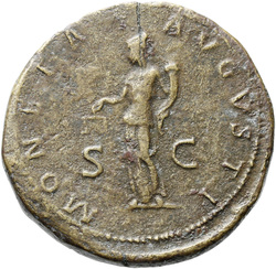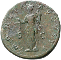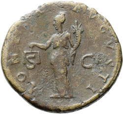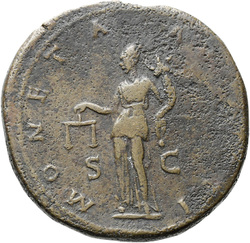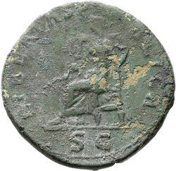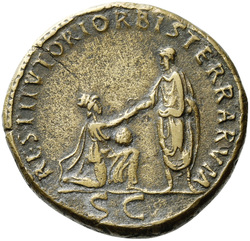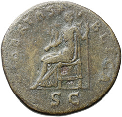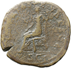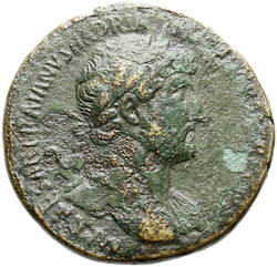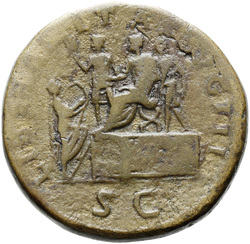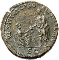 LIB[E]RALI[TA]S AVG III // S C (in exergue), Hadrian, togate, seated left on curule chair on platform, extending right hand toward citizen who is mounting steps up to platform, holding out fold of toga; behind, Liberalitas standing facing, head sometimes left, holding coin scoop; to right, attendant standing left