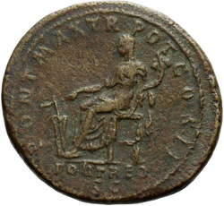 PONT MAX TR P[OT] COS III // S C (in exergue), Roma, helmeted, in military attire, seated left on cuirass, foot on helmet, holding Victory in extended right hand and vertical spear in left; beside cuirass, shield and pile of arms