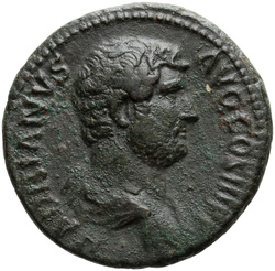 HADRIANVS AVG COS III P P, Bust of Hadrian, laureate, draped, right, viewed from side