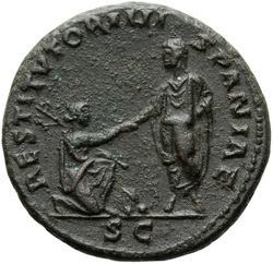 [A]DVENTVS AV[G] // [S C] (in exergue), Roma, helmeted, in military attire, standing right, holding vertical spear in left hand and clasping right hands with Hadrian, togate, standing left, holding scroll in left hand
