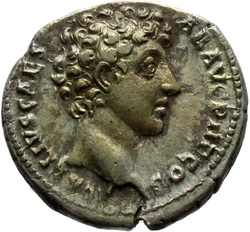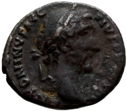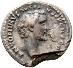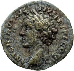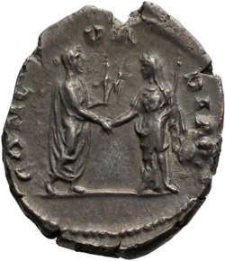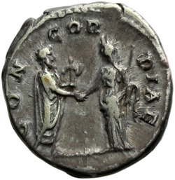 CONCORDIAE, Antoninus, togate, standing right, holding Victory in left hand and clasping right hands with Faustina the Elder, who stands left, veiled, draped, sceptre in left hand