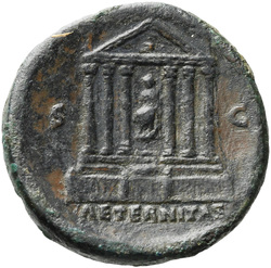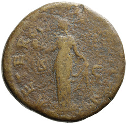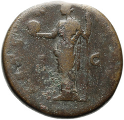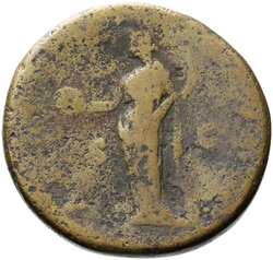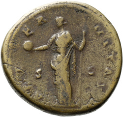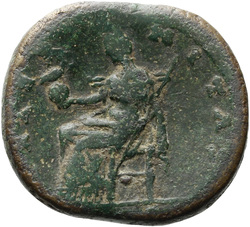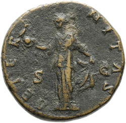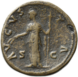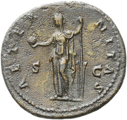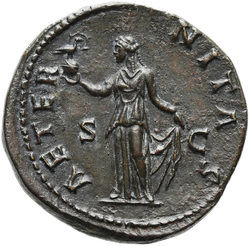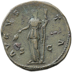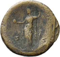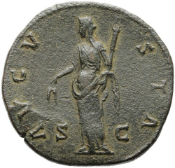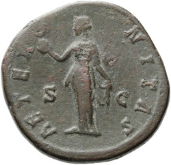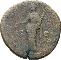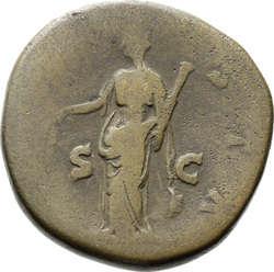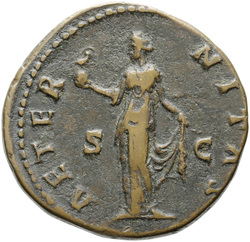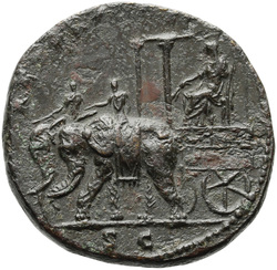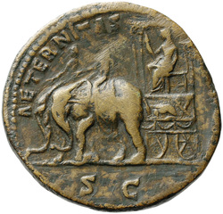 AETERNITAS S C, Faustina the Elder, veiled, draped, holding vertical sceptre in right hand, and resting left hand on knees, seated, left on throne in car, drawn by two elephants, driven left, by mahouts