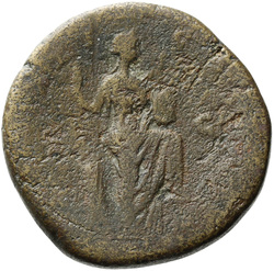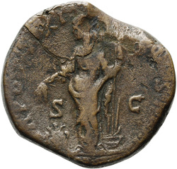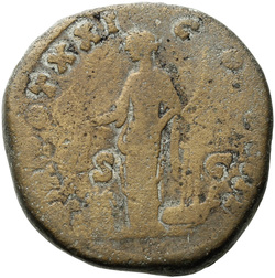 [TR POT XXI] C[OS IIII] S C, Annona, draped, standing right, holding rudder, vertical, on ground in right hand and modius with corn-ears on left knee in left: left foot advanced and set on prow, left knee bent