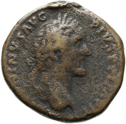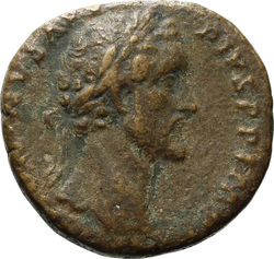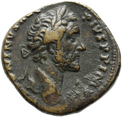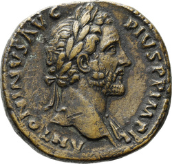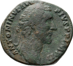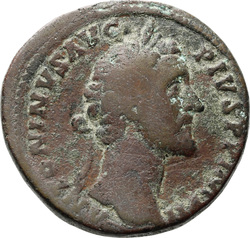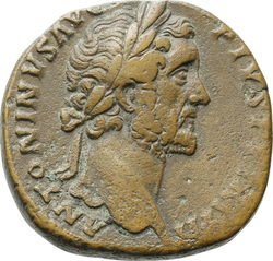 [ANT]ONINVS AV[G] PIVS P P IMP [II], Head of Antoninus Pius, laureate, right