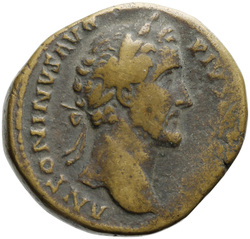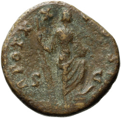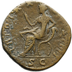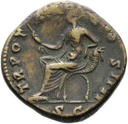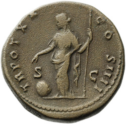 [T]R POT XX COS IIII S C, Annona, draped, standing right, holding rudder, vertical, on ground in right hand and modius with corn-ears on left knee in left: left foot advanced and set on prow, left knee bent