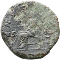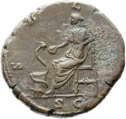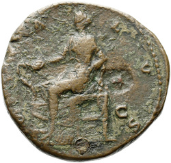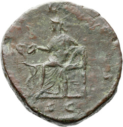 [L]IBERALI[TAS AVG P M TR P V IMP IIII COS III P] P [S C], Commodus, togate, seated left on curule chair on platform, attended by an officer; before him, Liberalitas, draped, standing left, holding tessera in right hand and corncuopiae in left hand; at left, citizen mounting right steps of platform