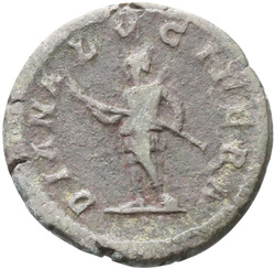 VENVS VICT[R]IX, Venus, naked to waist, standing left, holding apple in extended right hand and palm in left hand, resting left elbow on shield; at feet, left, Cupid