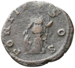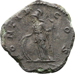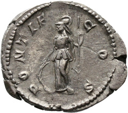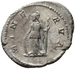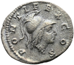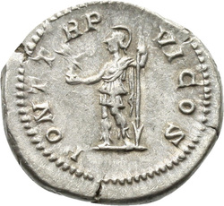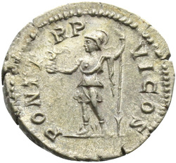 [P]ONTIF COS, Minerva, helmeted, draped, wearing aegis on breast, standing left, resting right hand on shield set on ground and holding spear in left hand