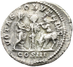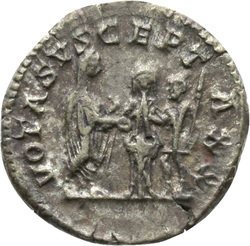 VOTA SVSCEPTA XX, Septimius Severus, veiled, standing right, sacrificing out of patera in right hand over altar; facing him, Caracalla (?), bare-headed, holding spear in right hand; behind altar, flute-player, facing