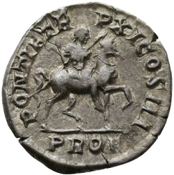 PONTIF TR P XI COS III PROF, Caracalla, in military attire, cloak floating behind, on horse prancing right, holding raised spear in hand; before, soldier, helmeted, walking right, head left, holding transverse spear in right hand hand shield in left hand