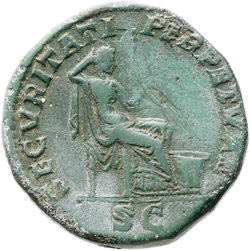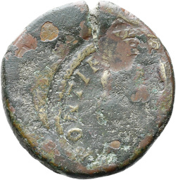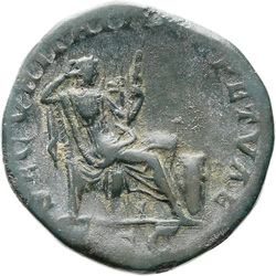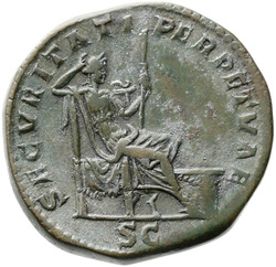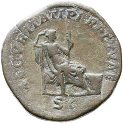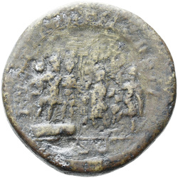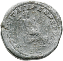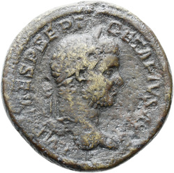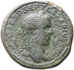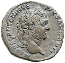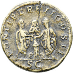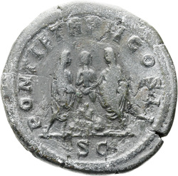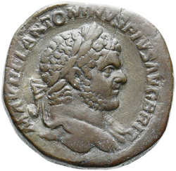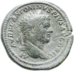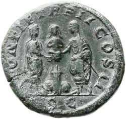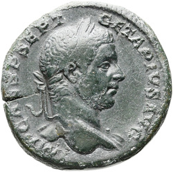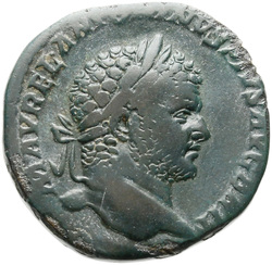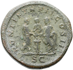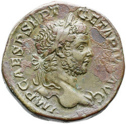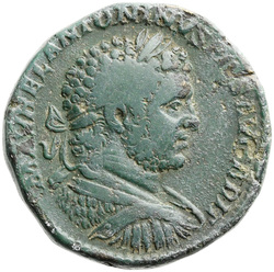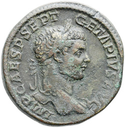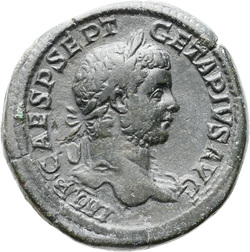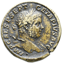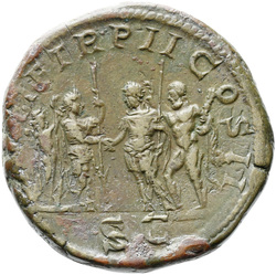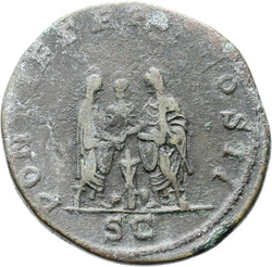 [PON]TIF TR P II COS II S C, Caracalla and Geta, in military dress, standing left and right, clasping right hands and holding spears in left hands; one crowned by Liber, standing right, holding thyrsus in left hand, and the other by Hercules, standing left, holding club in left hand