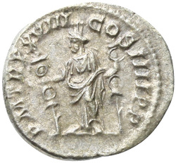 P M TR P XVIII COS IIII P P, Sol, radiate, naked except for cloak over left shoulder, standing front, head left, raising right hand and holding globe in left hand