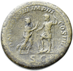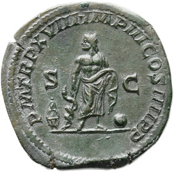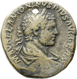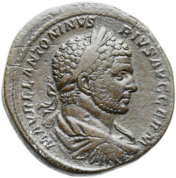 P M [TR] P XVIII IMP III COS IIII P P S C, Caracalla, in military attire, standing left, resting left foot on crocodile, extending right hand and holding vertical spear in left hand; opposite him, Isis, draped, advancing right, holding two corn-ears in right hand and sistrum in left hand