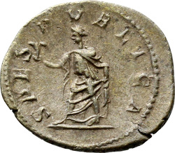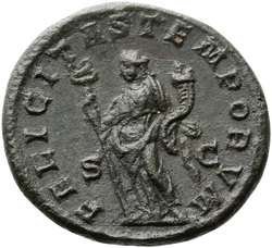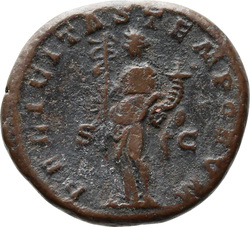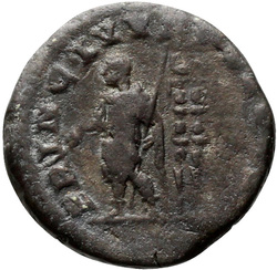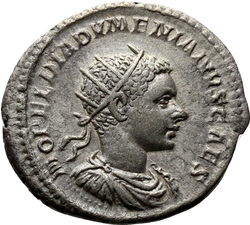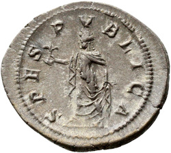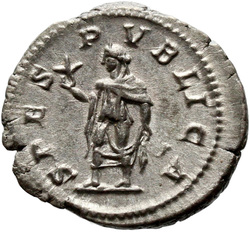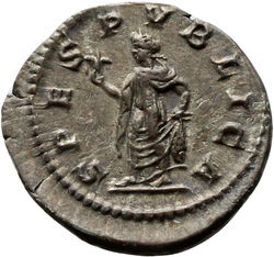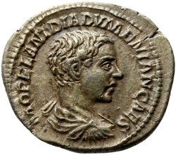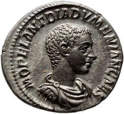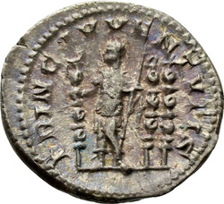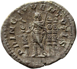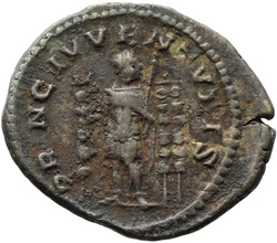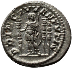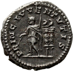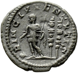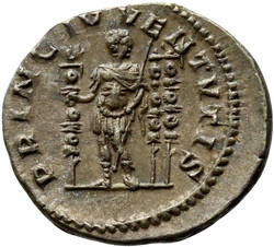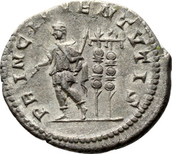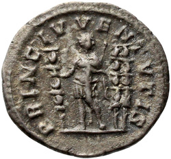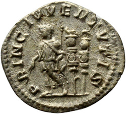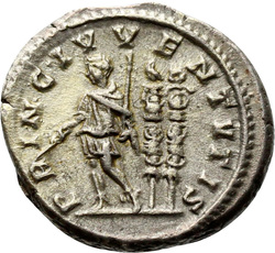 PRINCIPI IVVENTVTIS, Diadumenian, standing front, head right, holding standard in right hand and sceptre in left hand; on right, two standards surmounted by eagle, wreath on hand