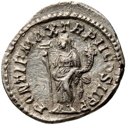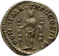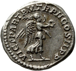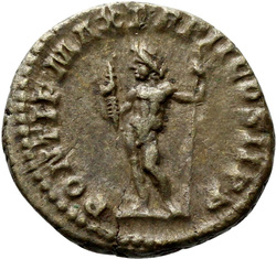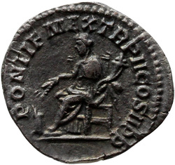 PONTIF MAX TR P, Roma, helmeted, draped, seated left, holding Victory in extended right hand and sceptre in left hand; by her side, shield