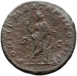 CONSERVATOR AVG, Sol, radiate, naked except for cloak over left shoulder and flying behind, advancing left, raising right hand and holding whip in left hand; in field, star