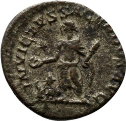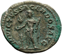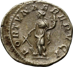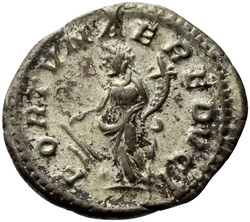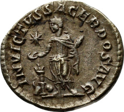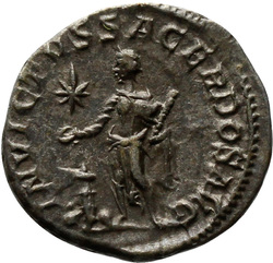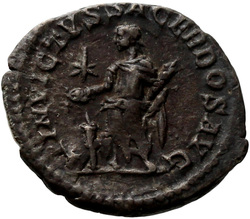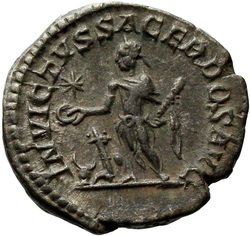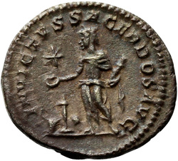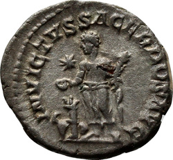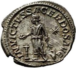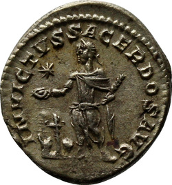 INVICTVS SACERDOS AVG, Elagabalus, in Syrian priestly robes, standing left, sacrificing out of patera in right hand over tripod, holding branch downwards in left hand; on ground, right, horn; in field, star